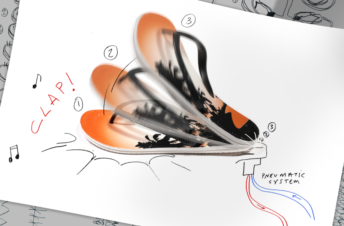 Meriem Bennani explore le vivre ensemble et la place de l’individu dans la collectivité. En chœur, en solistes, à l’unisson ou en réponse les unes aux autres, ces tongs évoquent les individus d’une foule en mouvement, dans une manifestation, un stade ou une dakka marrakchia, cérémonie musicale traditionnelle marocaine. Geste simple et banal, ce claquement de tong unit le groupe dans une même pulsation, et produit une force qui dépasse l’individu.